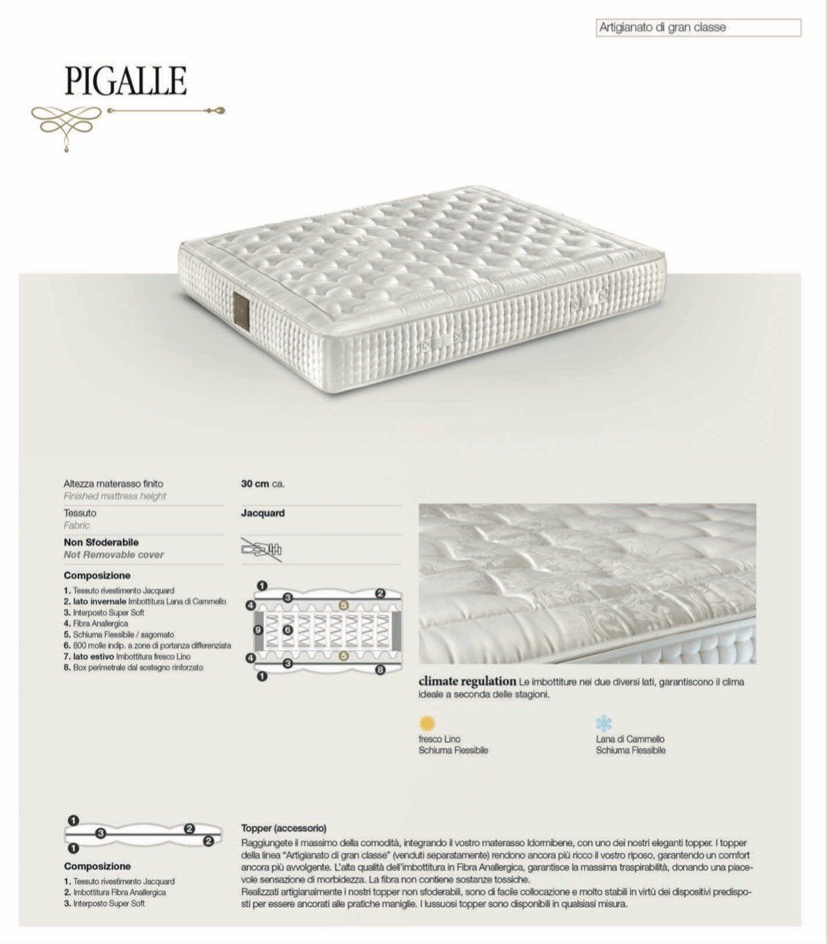idormibene Pigalle: pigalle offre un sostegno ottimale per un riposo rigenerante. Le morbide imbottiture naturali, concepite per un comfort perfetto, assicurano la massima traspirabilità durante il sonno. Un materasso realizzato per conservare a lungo nel tempo le proprie caratteristiche a favore di una postura corretta. Materasso non sfoderabile, trapuntato dal concetto moderno, realizzato artigianalmente, con molle insacchettate e imbottiture naturali come la lana di cammello e il lino, che offrono una sensazione piacevole di morbidezza. Altamente traspirante, grazie ai suoi lati climatizzati, garantisce un microclima ottimale per tutto il periodo del riposo.