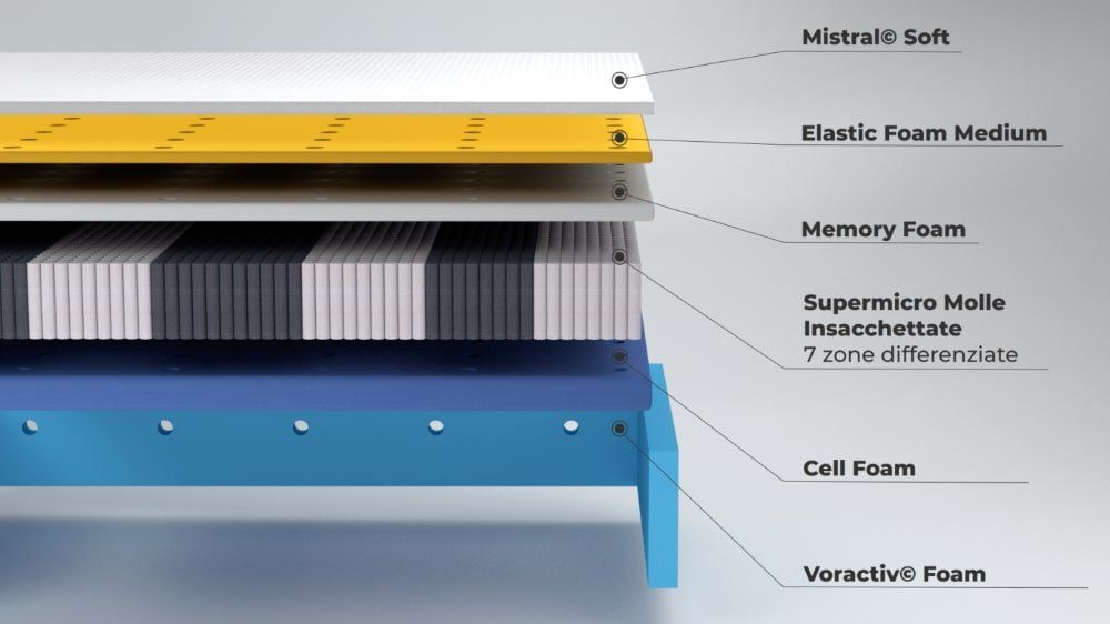 - Supermicro Molle Insacchettate: Spessore 14 cm. Portanza Elevata ∼ 3.000 molle nel matrimoniale,7 zone differenziate;