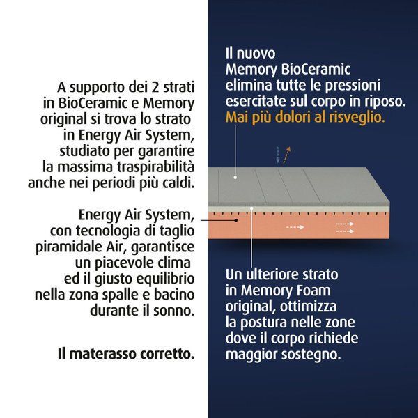 - idormibene: energy Memory è il materasso di nuova generazione che beneficia della doppia tecnologia BioCeramic, integrata nel memory e nel tessuto di rivestimento.